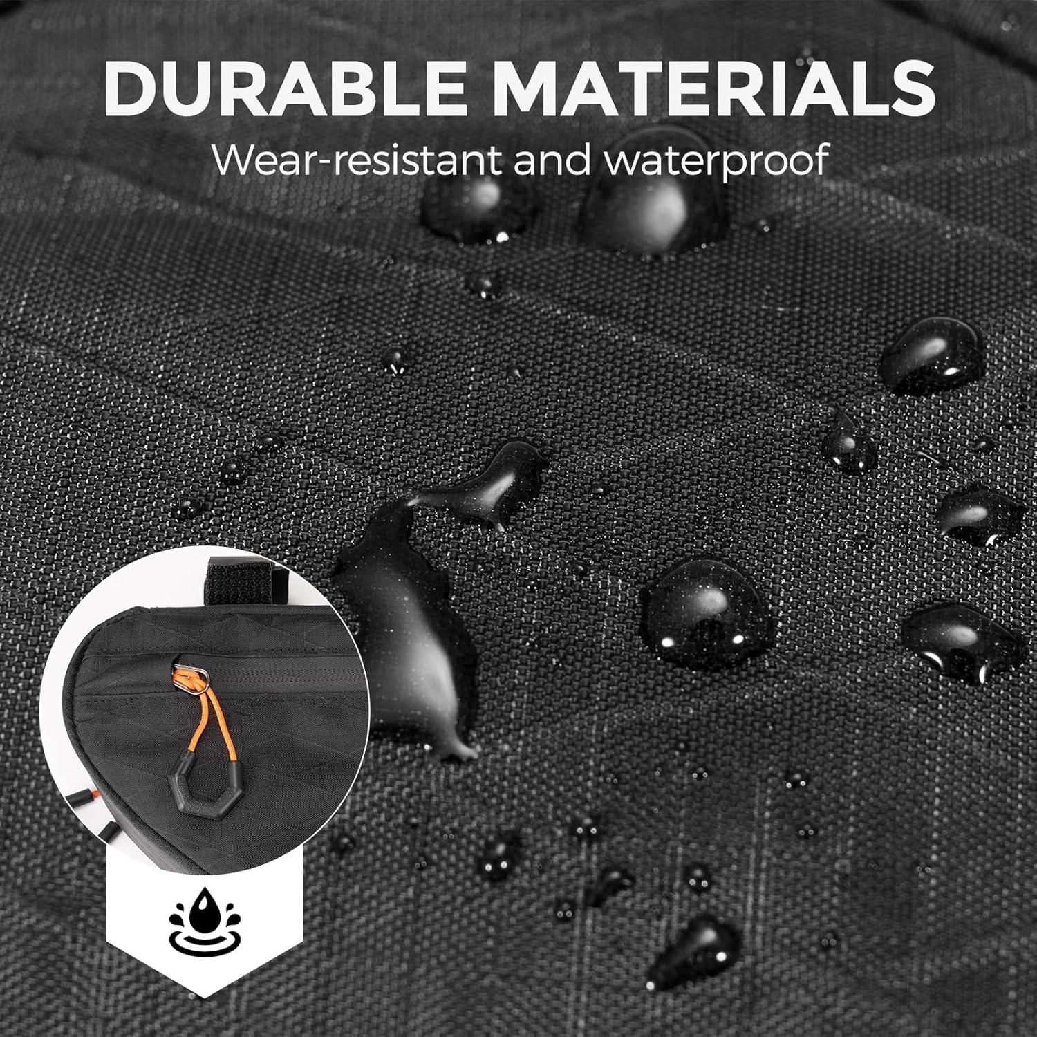 WATER-RESISTANT DESIGN: The bicycle bag made of premium nylon fabric with water-resistant coating, and design with waterproof zippers, this under top tube bag is able to survive from the rain day.Forget the weather,just enjoy your cycling trip
