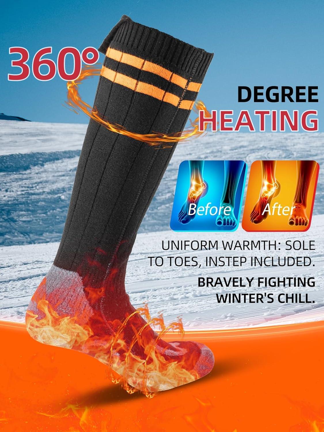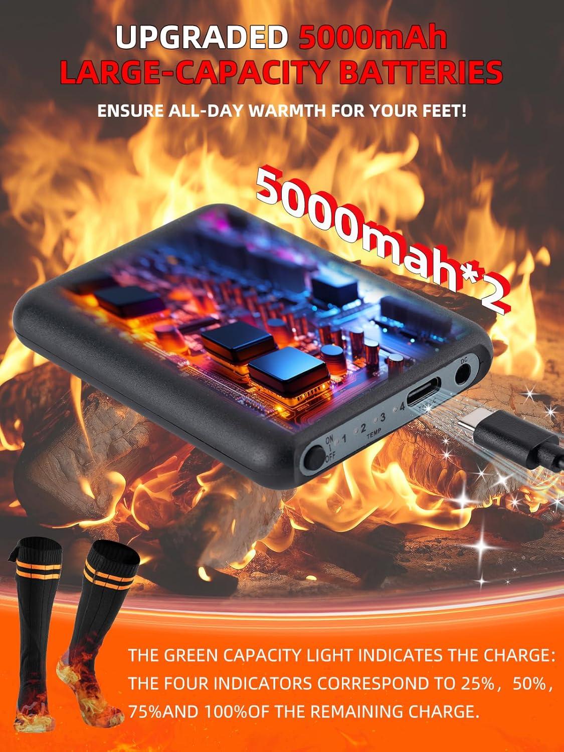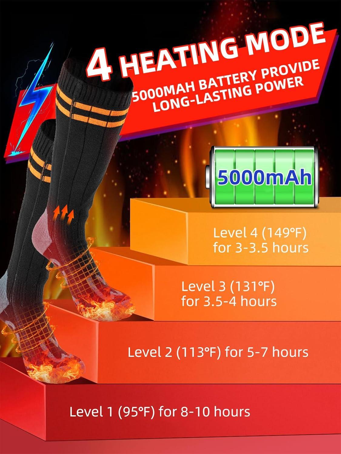 Long-Lasting Warmth: Powered by a 5000mAh Battery – Our rechargeable heated socks for men keep you warm for up to 3-10 hours. With temperatures reaching 149°F, the heating elements focus on the toes and full-foot, ensuring toasty feet, making them perfect for bad circulation, cold feet, and stiff joints