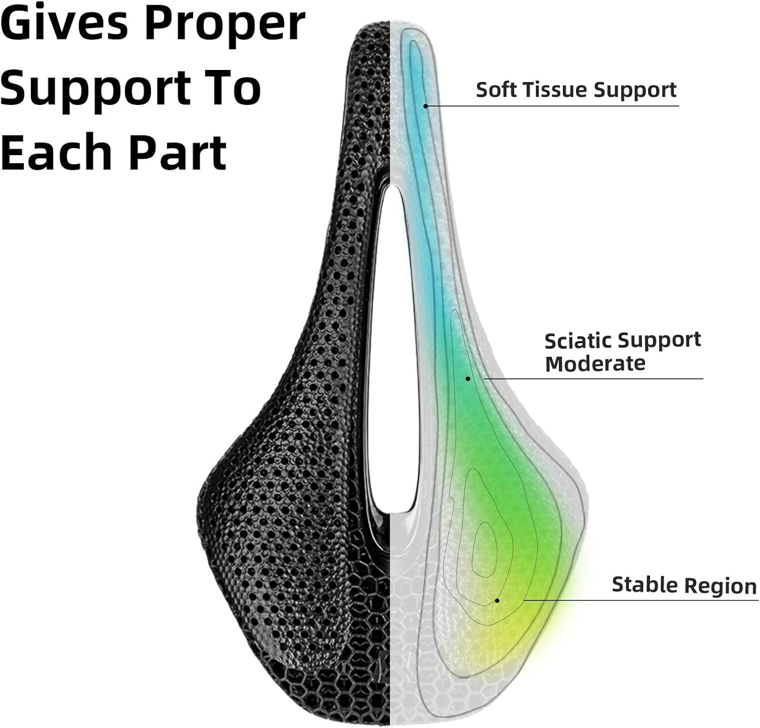 Ergonomic 3D Printed Design: The breathable honeycomb liquid resin cover offers a unique non-slip surface, providing stability and comfort during your rides. Ergonomically crafted, this saddle enhances your biking experience while adding a stylish touch to any bike