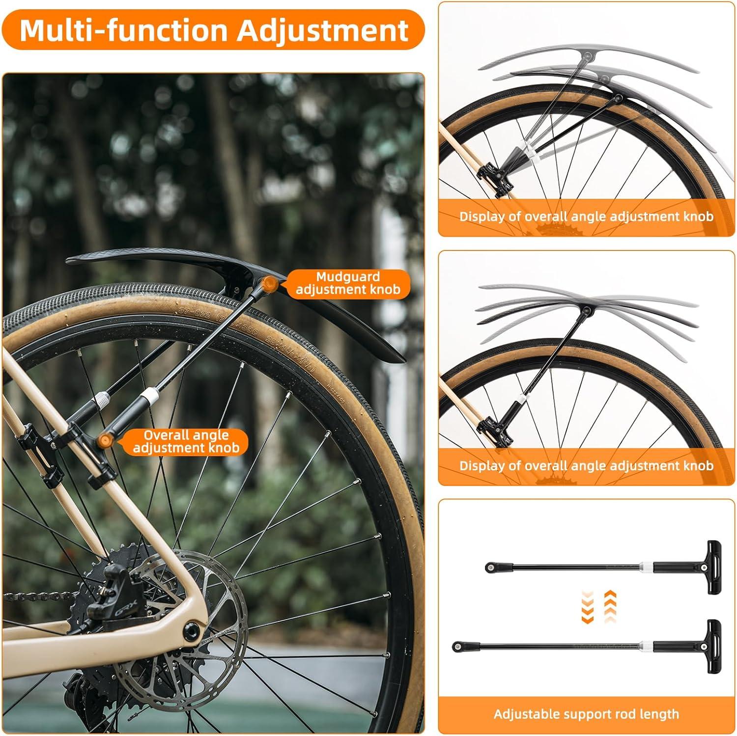 【Multi-angle Adjustment 】You can find the right angle for your bike tires by adjusting the two gears. The length of the bike mud guard support rod also supports adjustment within the range of 28-32CM