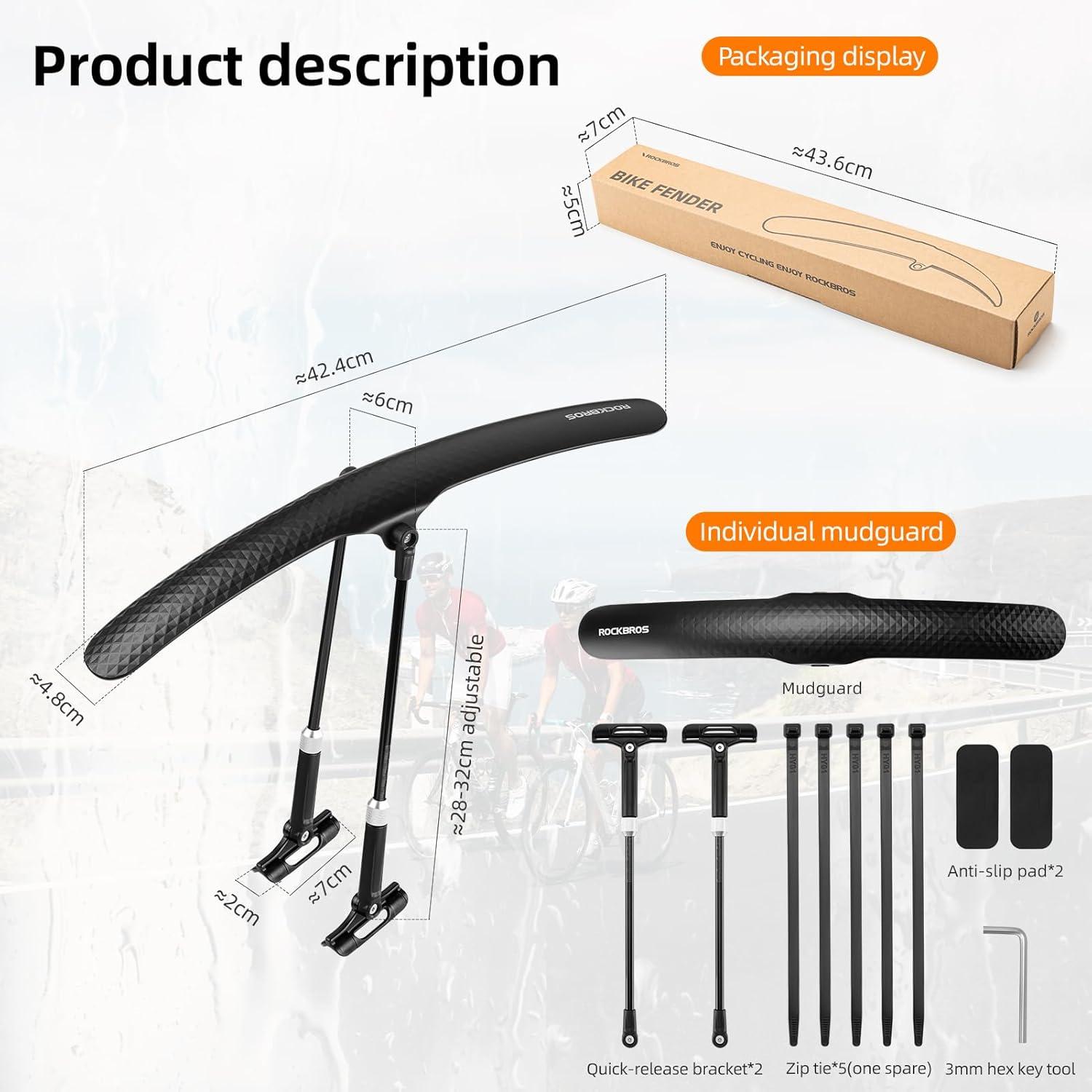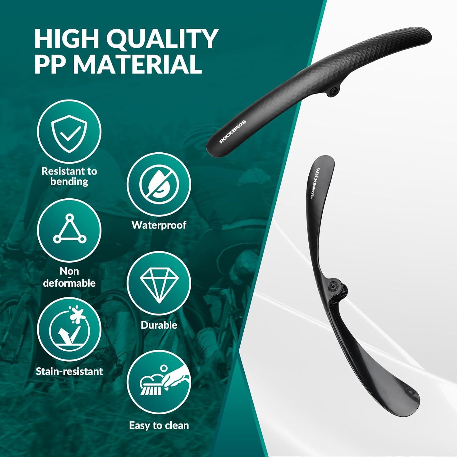 【Durable & Sturdy】 ROCKBROS bike fenders are made of PP material, which is tough and not easy to break. It will not deform even under the sun exposure. The design of two gears makes the bicycle fender very stable during riding without shaking