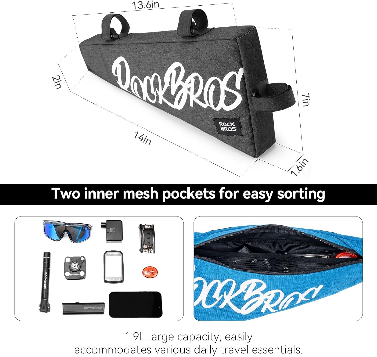 Spacious Storage: With a 1.9L capacity, this bike frame pack provides ample space for your essentials, such as your phone, keys, wallet, gloves, glasses, energy bars, and repair tools. The two internal mesh pockets help keep everything organized and easily accessible, ensuring a tidy and efficient ride.