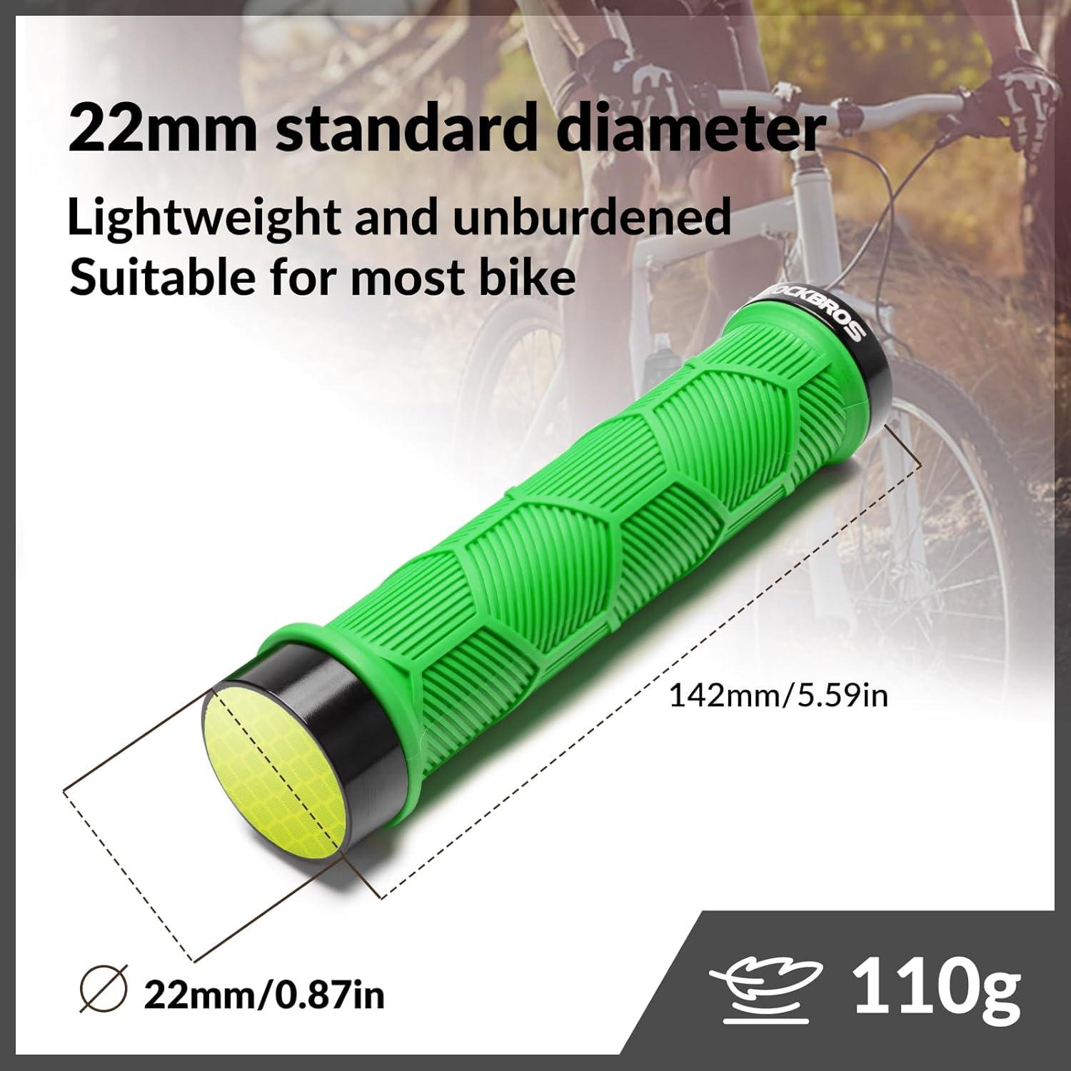 ROCKBROS Bike Handlebar Grips – 22mm Dual Lock-On Rubber Grips with Reflective End Caps, Anti-Slip Design Inspired by Powersports Grips – Fits MTB, BMX, Road & Folding Bikes–5 Colors(Green)