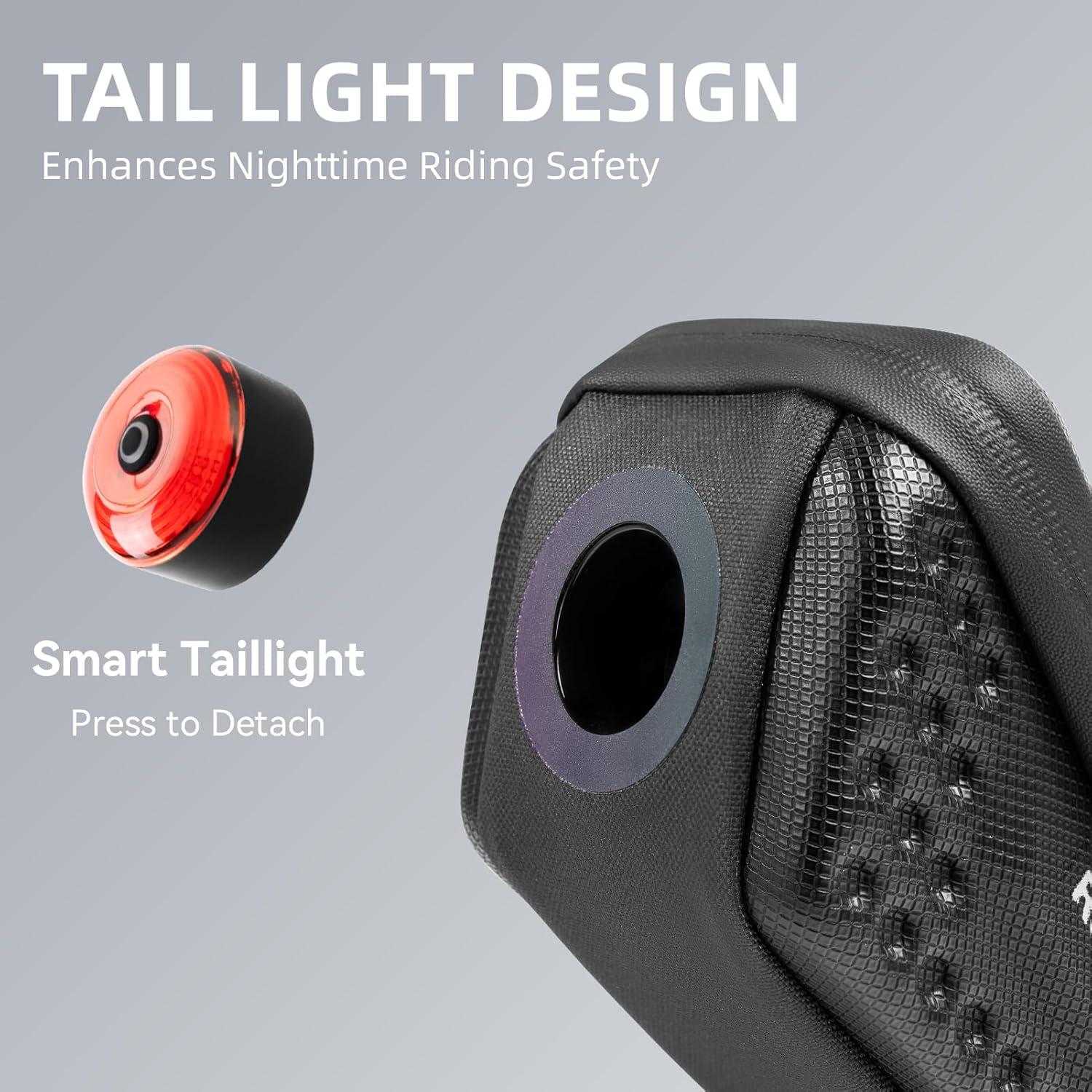 Dual security protection:This saddle bag comes with tail lights, and the outer ring of the tail lights is colorful and reflective, with waterproof function. The design adopts innovative pressing embedded tail light design, which is easy to install. Improved nighttime cycling safety and provided cycling support for riders