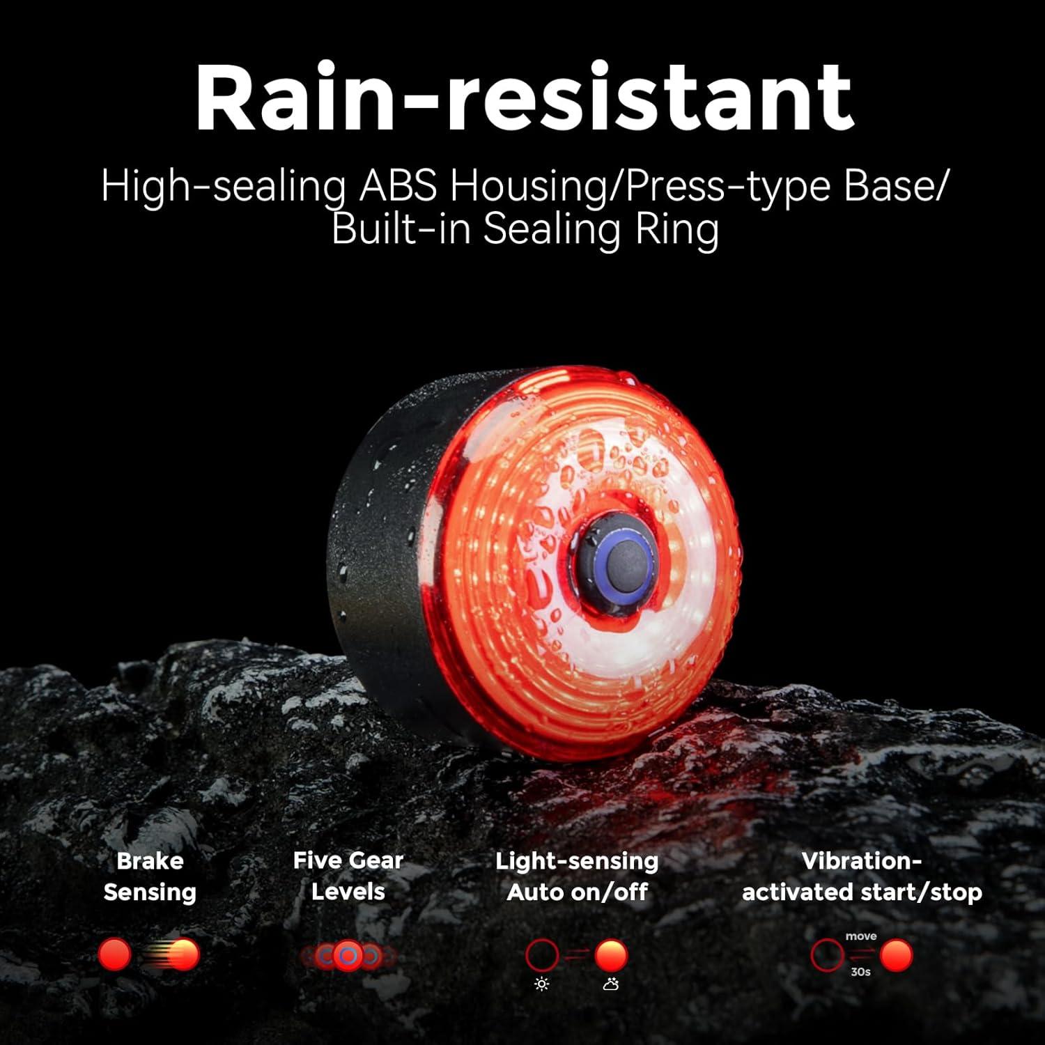 Brake sensing and auto on/off: When cycling brakes or decelerates, the taillights automatically light up, transmitting deceleration information to the rear to enhance safety. Intelligent detection of ambient light, autonomously determining the brightness based on the strength of the light. Intelligent vibration wake-up, automatic sleep mode after 30 seconds of static rest, automatically lights up when feeling vibration, safe and convenient