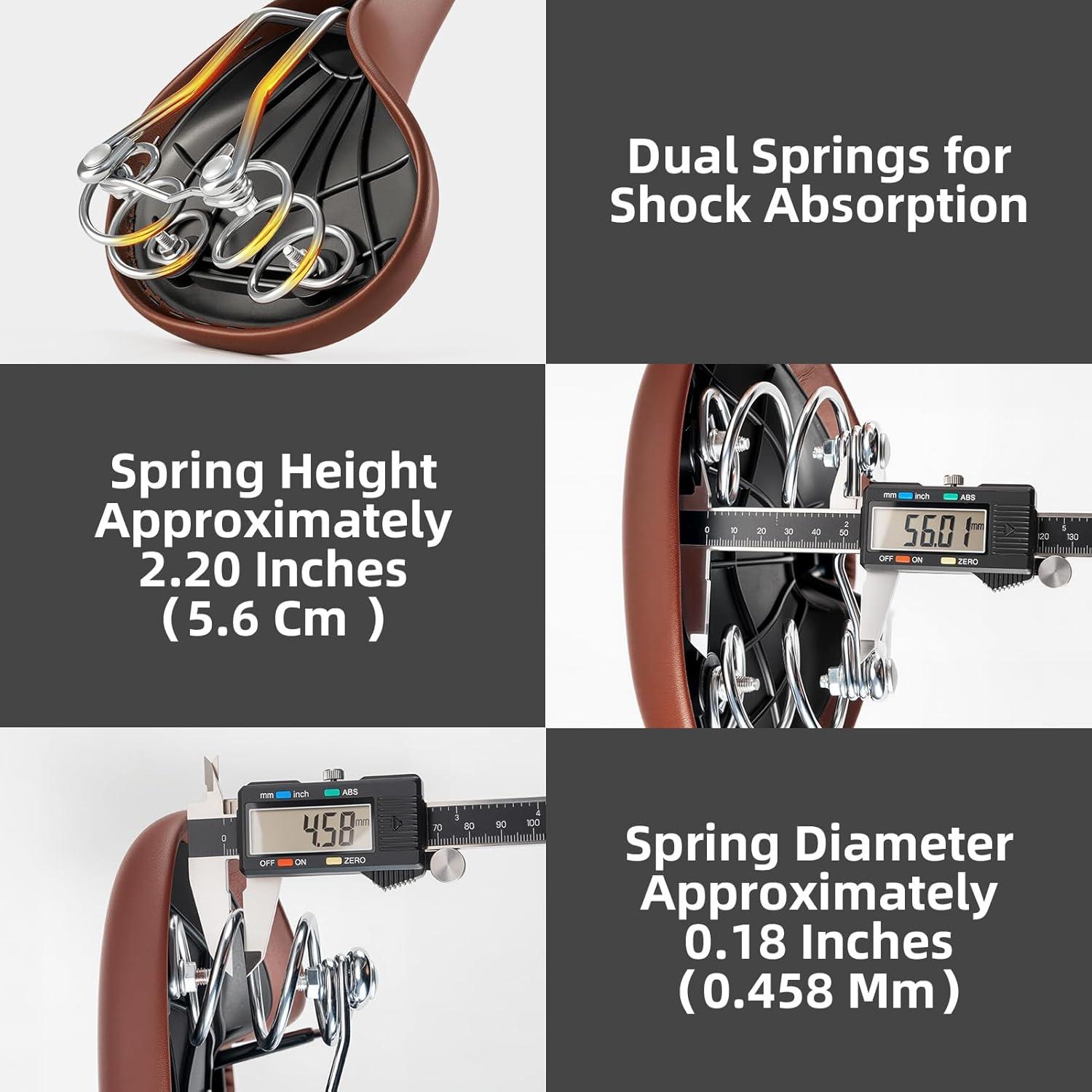 Dual-Spring Shock Absorption:High-strength metal springs (approx. 56mm height x 4.5mm diameter) efficiently cushion vibrations from uneven terrain, enhancing this bike saddle's comfort during city commutes or leisure rides