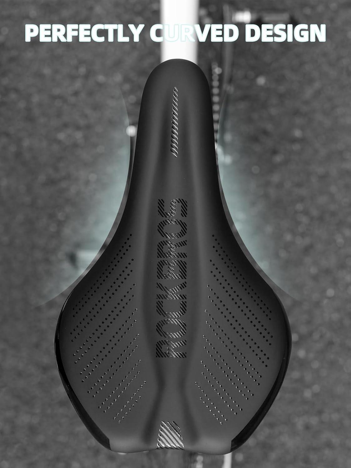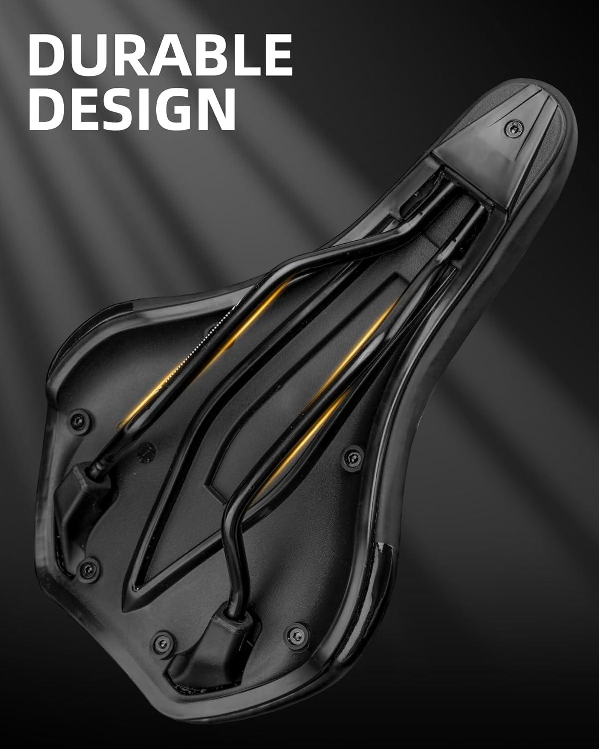 [DURABLE DESIGN]: Crafted from high carbon steel, the Bike Seat ensures exceptional toughness and resists deformation over time. Its narrow front and wide back design prevents thigh rubbing for a comfortable ride.