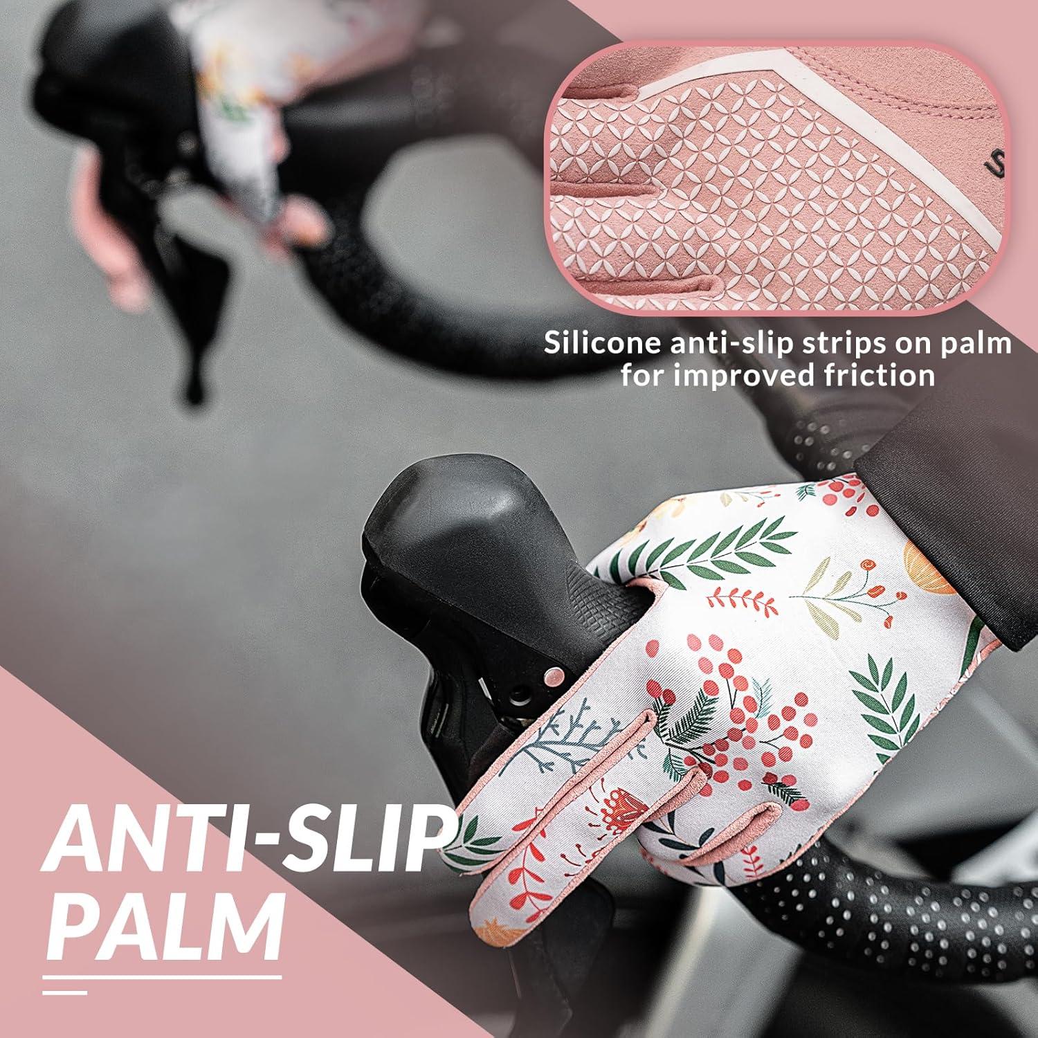 【Anti-slip Texture】: The palm and fingers of these women’s cycling gloves feature an anti-slip silicone texture, providing excellent grip. Whether you're gripping your bike's handlebars or holding onto your phone, these gloves ensure a secure hold