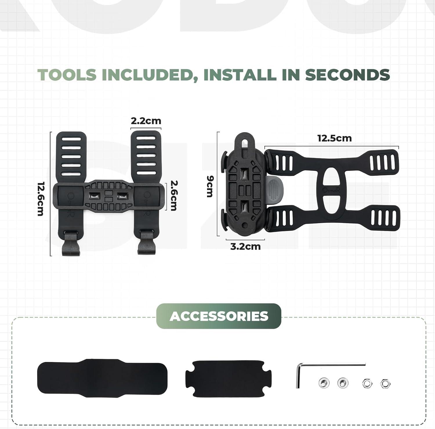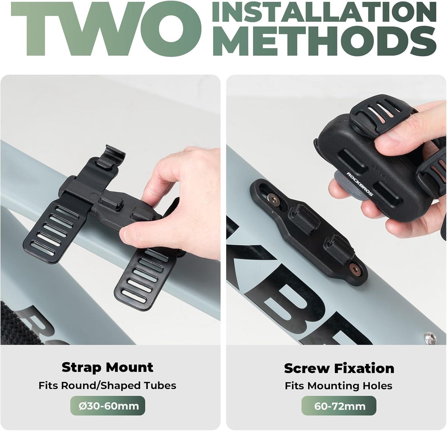 Two Installation Methods: Strap Installation: Suitable for round or irregular tubes with a diameter of 30-60mm. Features an E05-V male buckle design for simple and fast installation Screw Fixation Installation: The E05-U male buckle is suitable for bikes with pre-installed water bottle screw holes, supporting a screw hole distance of 60-72mm for a stable and reliable installation