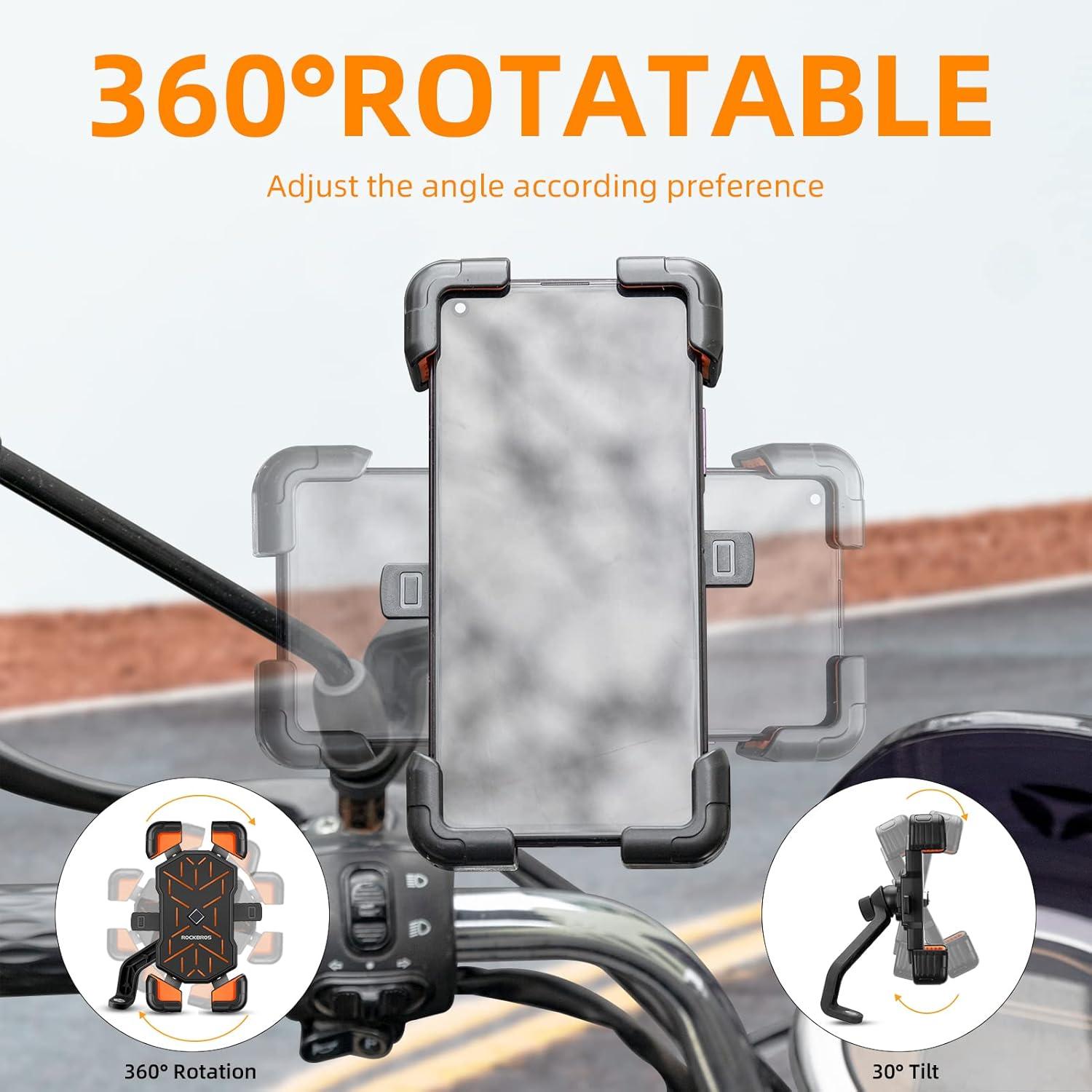 360°ROTATABLE. The bicycle holder can be adjusted at will to the visual angle according to personal preference. After adjustment, tighten the knob to secure phone clamp. The screen is unobstructed so that the phone can be easily operated at any time. It's stiff enough that you can easily interact with the phone.