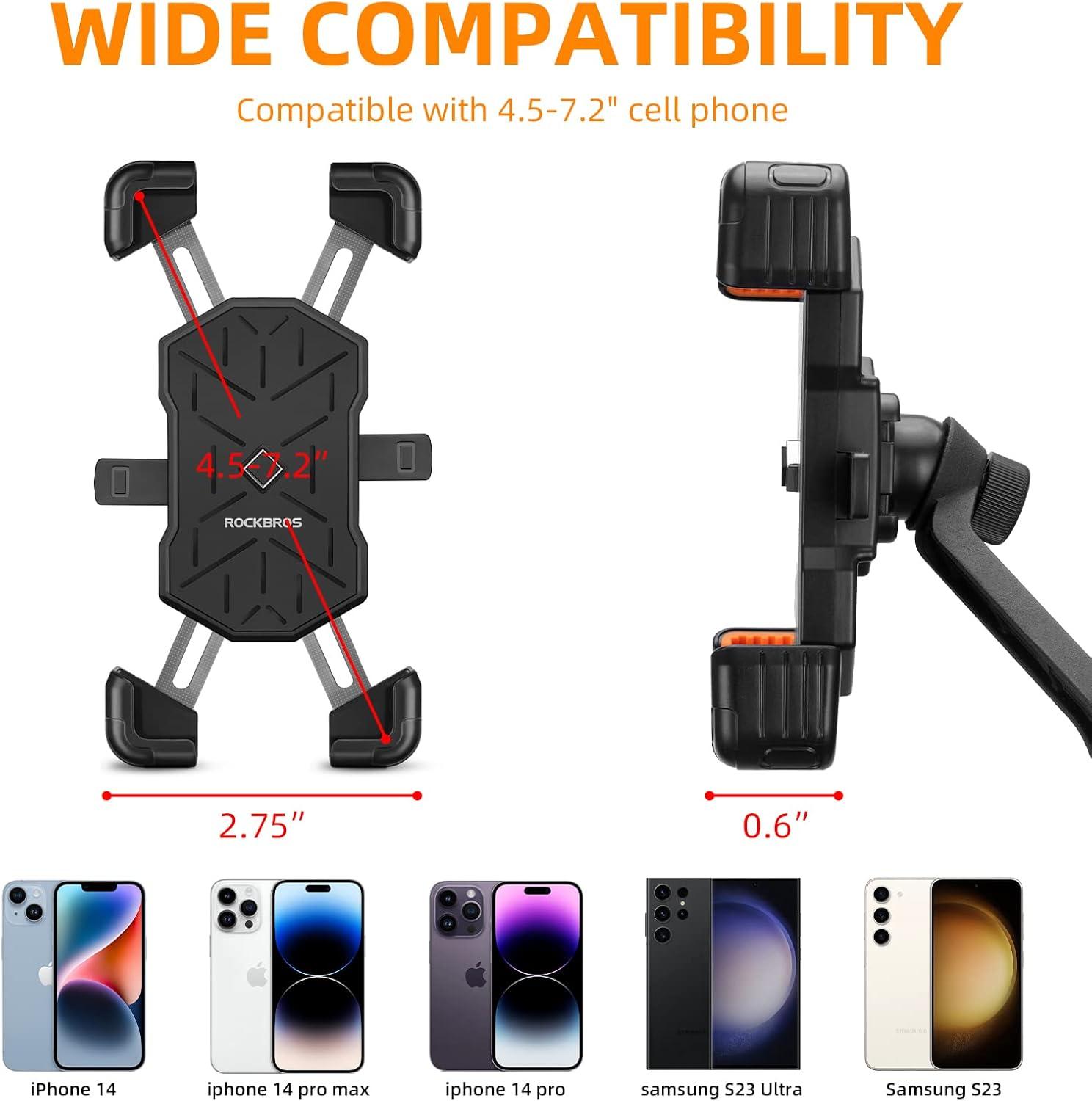 WIDE COMPATIBILITY. The bike holder fits for cell phone(4.5 inches to 7.2 inches), up to 15 mm thick (including case). Such as iPhone 14/ 13/ 12 Pro Max, Pro, Mini,Galaxy S23 Ultra/ S23+/ S23/ S22 and more cell phones. The bike phone holder handlebar mounting base fits for handlebars 0.78''(20mm)/0.86''(22mm). The rear view mirror mounting suits for 0.39''(10mm).