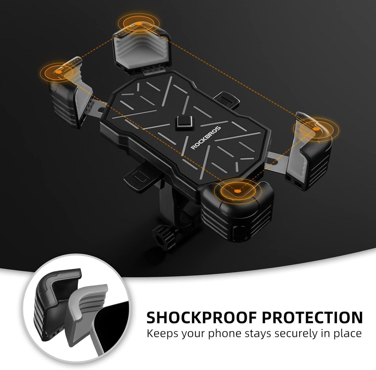 STURDY & SHOCKPROOF PROFECTION. Made of thickened silicone anti-slip pads, bike phone mount isolates the phone from a huge amount of shock. Keeps that your phone stays securely in place even on the bumpy roads. The all-round rubber pad on the phone clip protects your phone from scratches and slips.