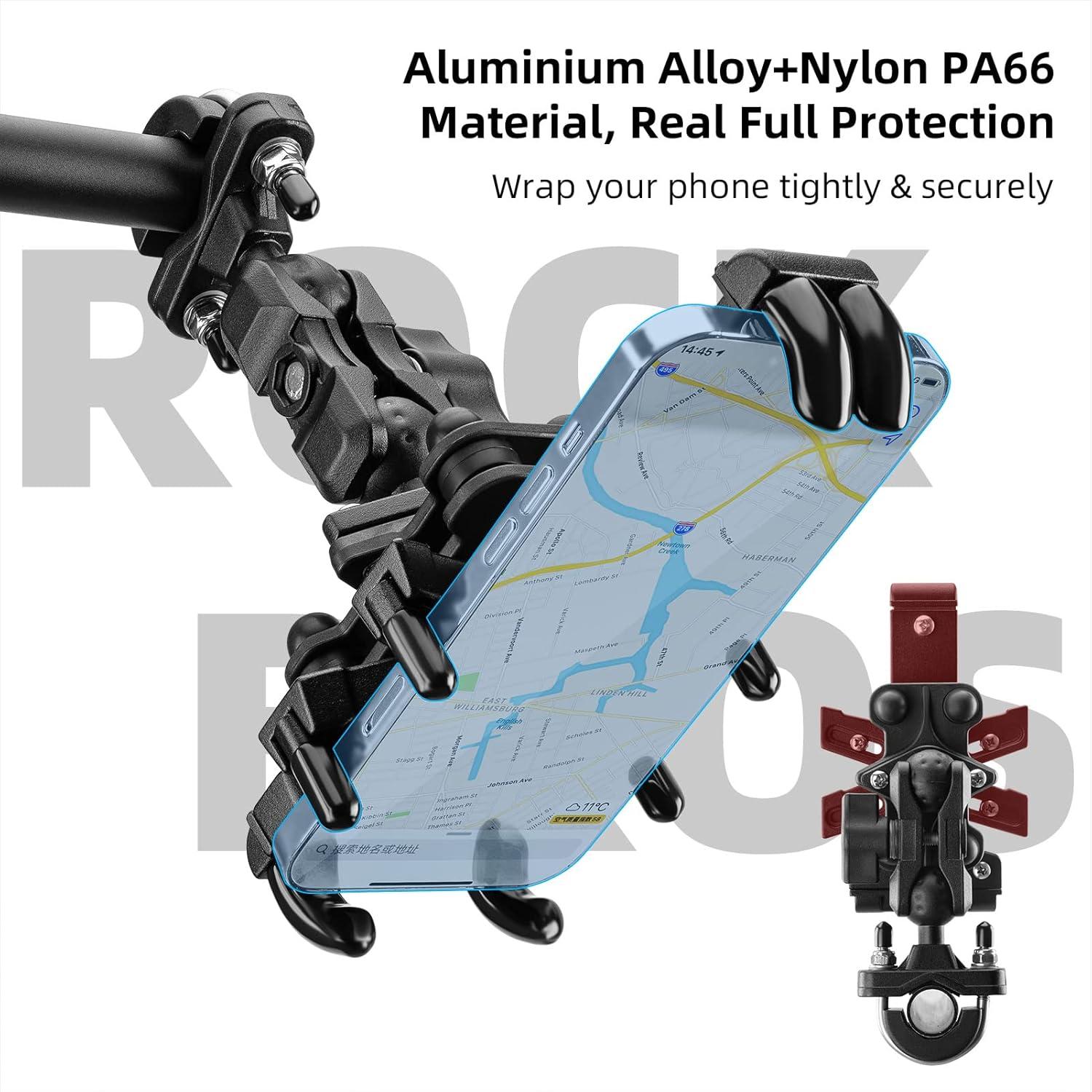 STURDY & SECURE: The main body of our motorcycle phone mount made of premium aluminum alloy and soft silicone which is more solid to ensure your phone’s safety.What’s more, ROCKBROS bike phone holder features 8 silicone cushions to fix your devices, keep your phone from scratches and vibration, ensuring the safety of your phone under any circumstances, achieve the ultimate stability and security on bumpy roads.